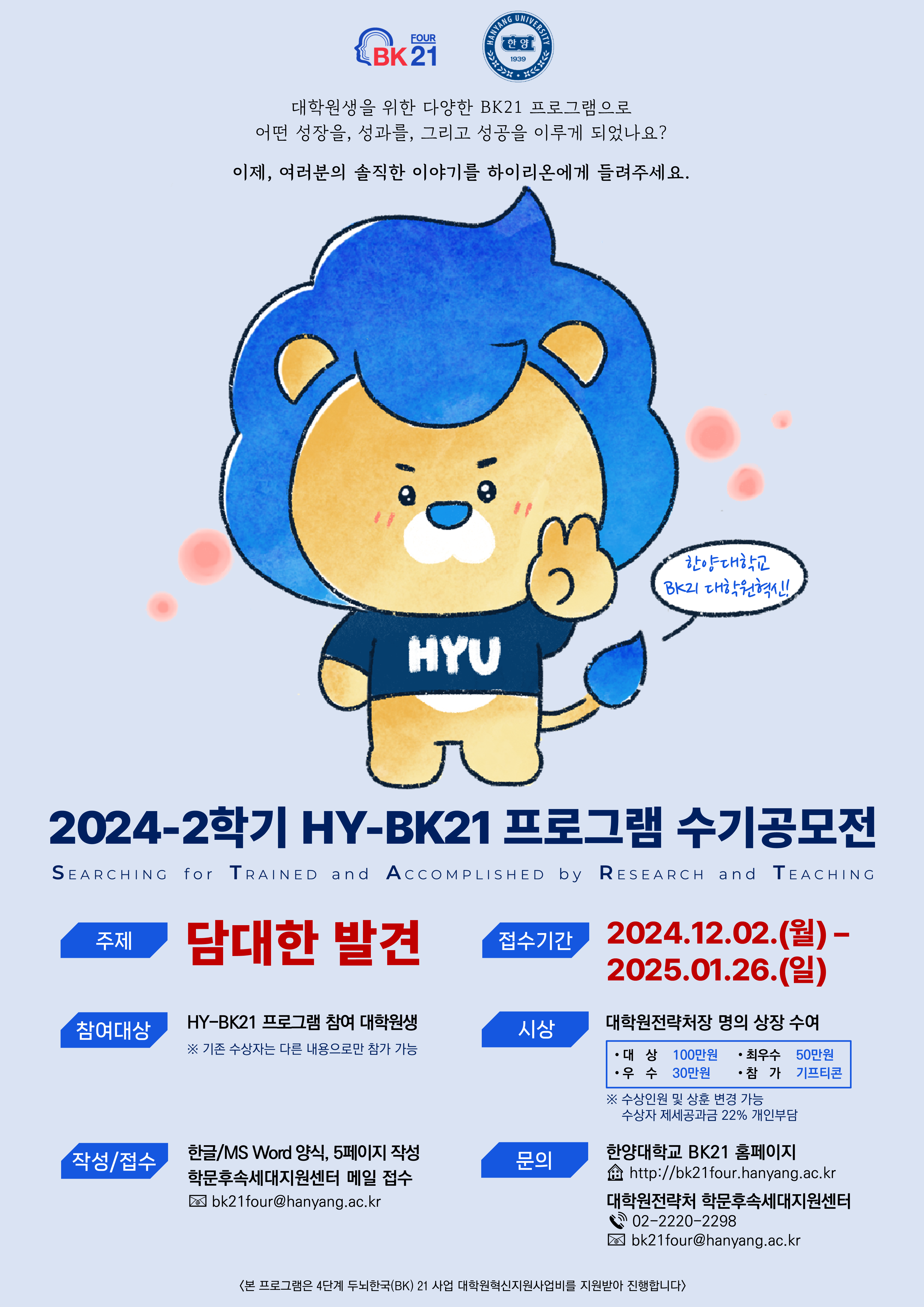 4단계 BK21 대학원 혁신지원사업의 일환으로 2024-2학기 HY-BK21 프로그램 수기 공모전(HY-START)을 안내하오니 관심있는 학생들의 많은 참여 바랍니다.