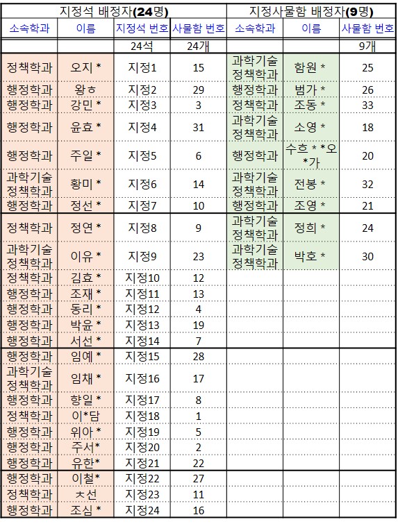 24년2학기 공용연구실 배정현황입니다. 24학년2학기 지정좌석 및 사물함 배정은, 신청자 중에서 (1) 이번 학기 논문제출 예정인 풀타임 재학생 위주로 (2)이번 학기 논문을 제출할 예정인 연구등록생 위주로 되었습니다.