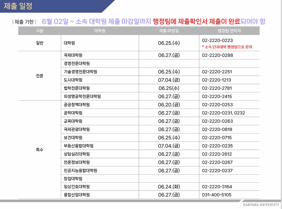1. 제출일정: 2025.06.02.(월)부터 각 대학원 제출마감일까지(정책과학대학은 일반대학원이므로 06월25일까지 제출)