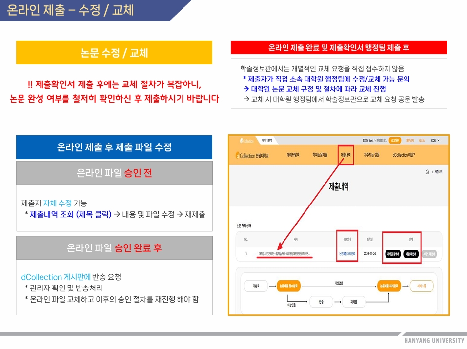 - 온라인 제출 완료 및 제출확인서 행정팀 제출 이후의 수정/교체 대상 논문은 대학원 논문 교체 규정 및 절차에 따라 진행됨. 소속 대학원 행정팀에서 확인 후 백남학술정보관으로 교체 요청 공문 발송(일반대학원은 단과대학에서 백남학술정보관으로 직접 발송)