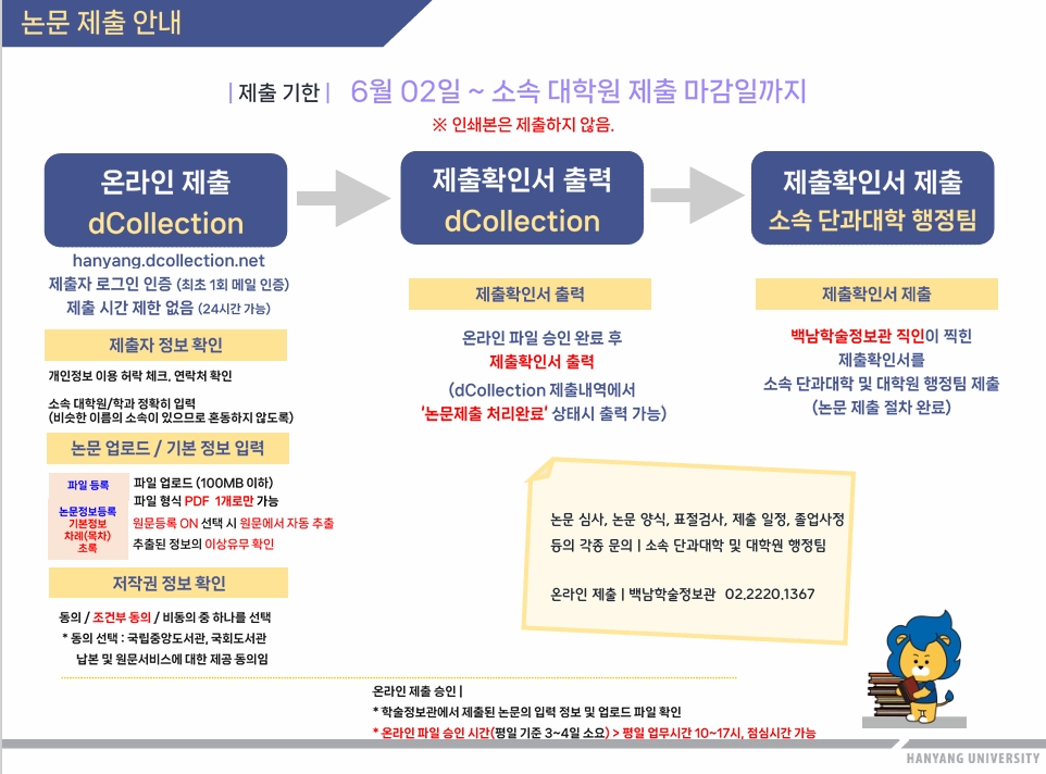- 학위논문 ”제출확인서”을 소속 단과대학 행정팀에 제출해야만 졸업대상자에 포함되므로, 백남학술정보관에서 온라인 논문 제출후 반드시 제출확인서를 행정팀으로 06월25일까지 제출해주셔야 합니다.