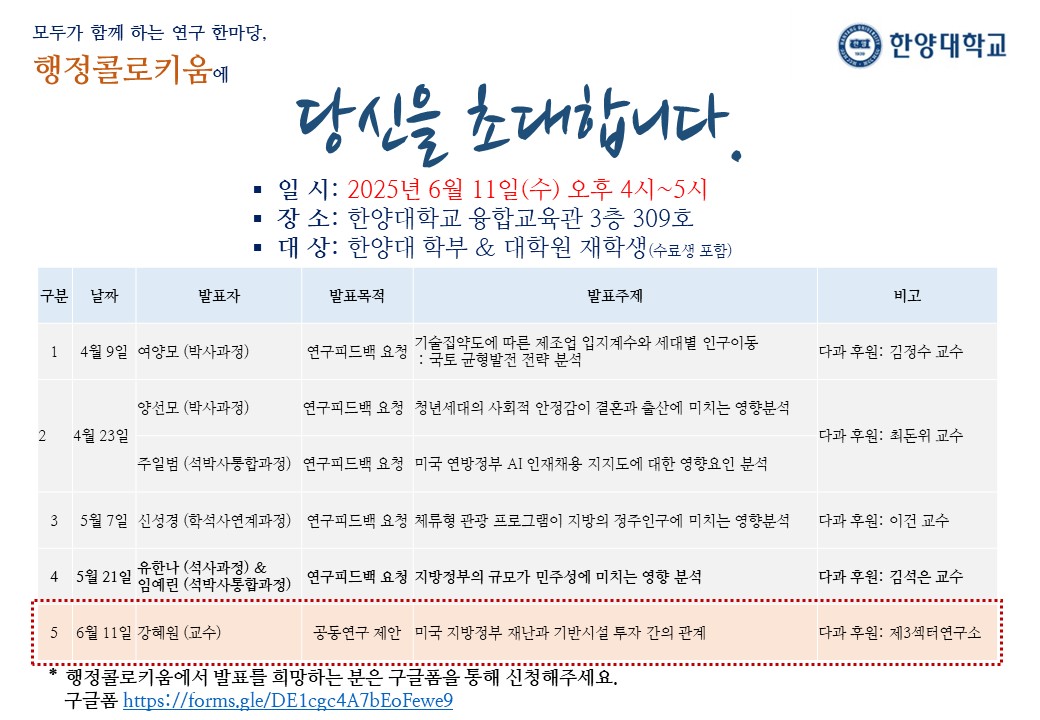 ★★★행정학과 <행정콜로키움> 초대장 (6월 11일)★★★