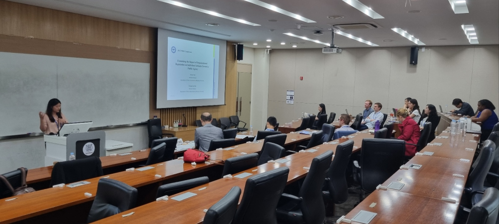 이 같은 국제적 학술대회에 우리 행정학과의 신성경(22학번) 학생이 연구논문을 발표하는 쾌거가 있었습니다. 신성경 학생은 최돈위 교수와 함께 연구해온 Organizational Reputation에 대한 연구를 직접 발표하였습니다. 국내 정부기관을 대상으로 한 실험연구를 통해 신성경 학생은 Organizational Reputation 연구에 이론적으로 기여할 뿐만 아니라, 실제 정부기관에서 Reputation을 어떻게 활용해야할 지에 관한 실용적 시사점을 제공하였습니다. 신성경 학생의 발표를 들은 교수 및 박사생들은 해당 연구에 깊은 관심을 표하면서, 많은 질문들을 쏟아내기도 했습니다.