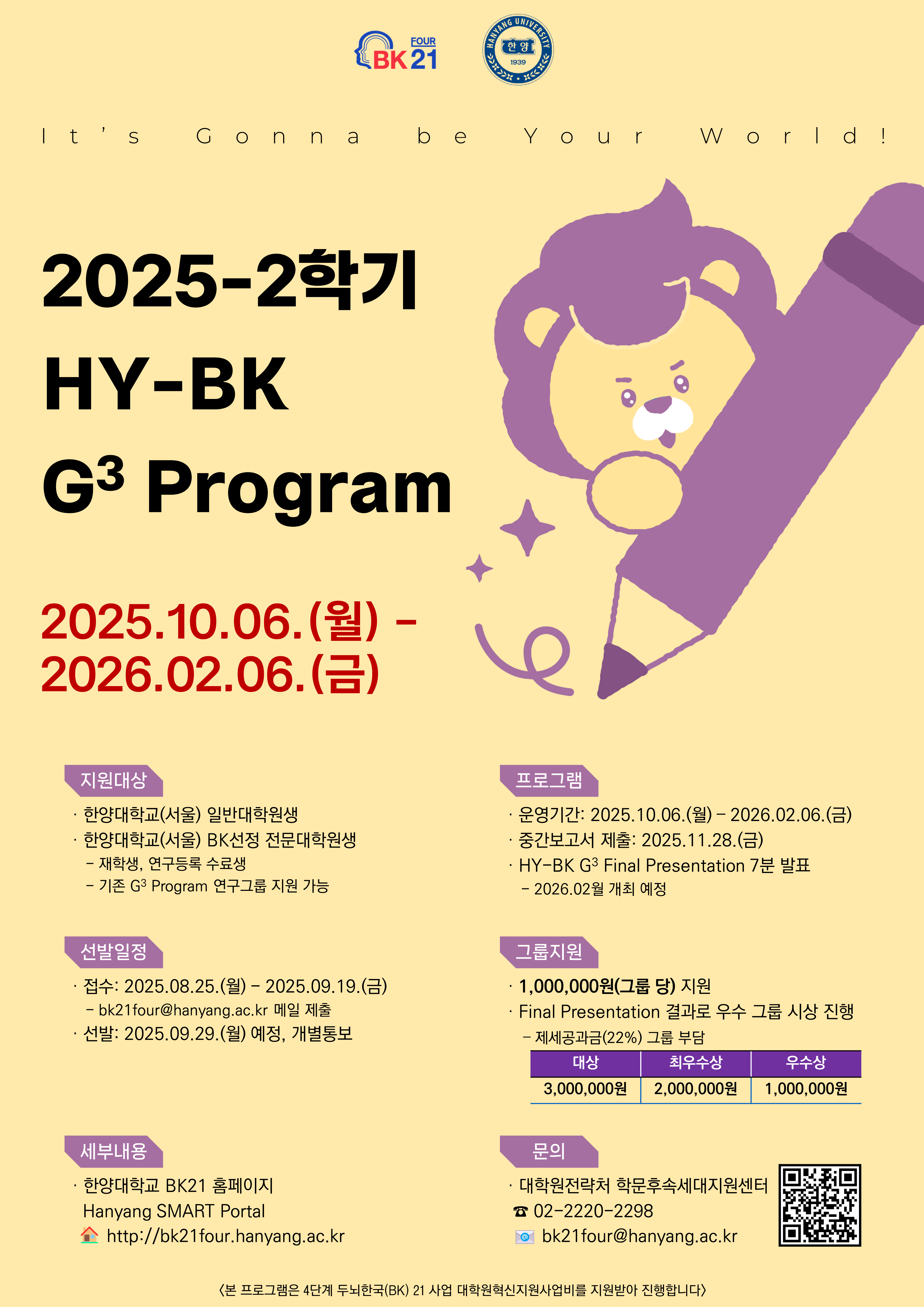 - 붙임 1. 2025-2학기 HY-BK G3 Program 선발 안내문.pdf 44.3KB Hit 52