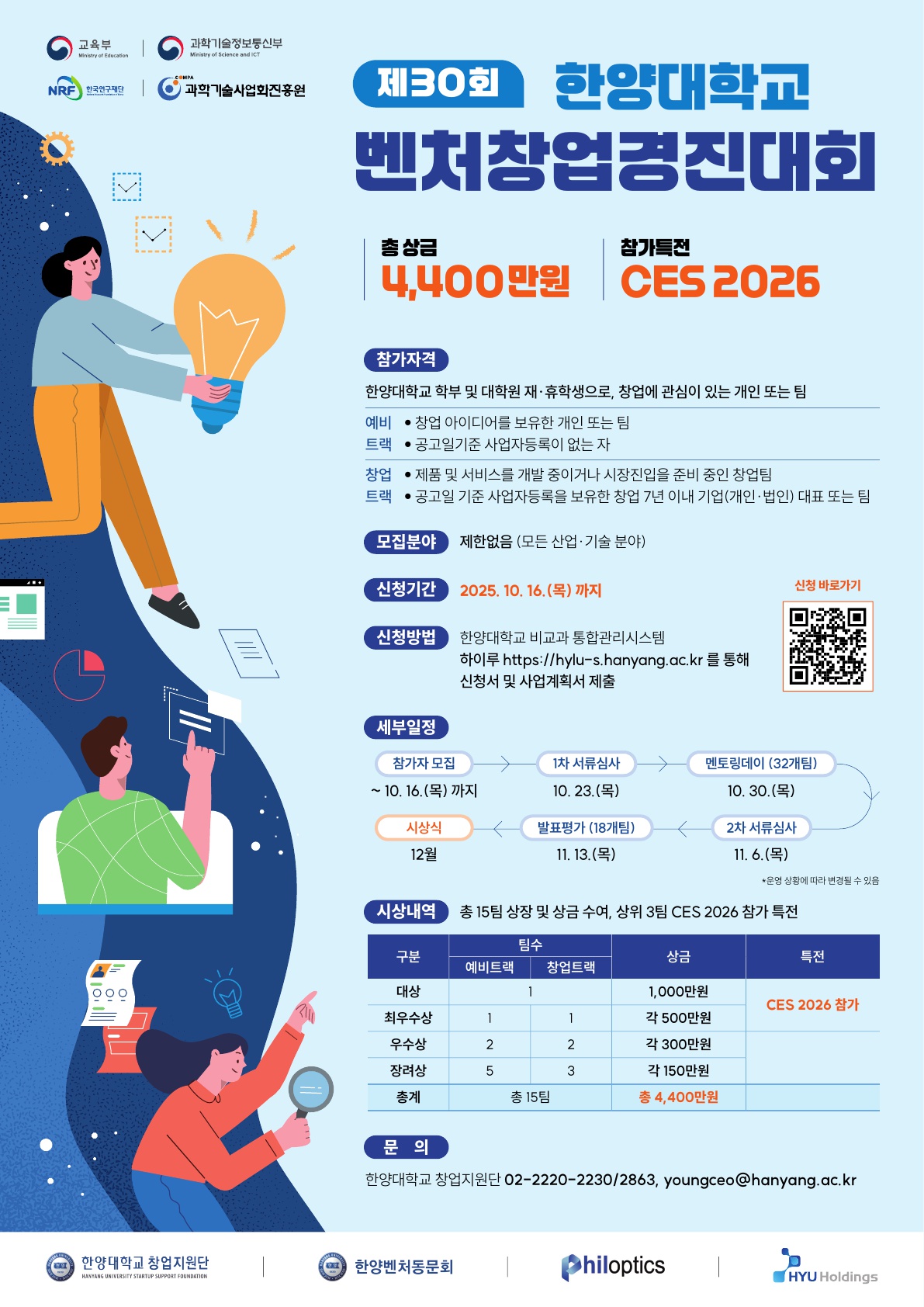 문의: 한양대학교 창업지원단(02-2220-2230, 2863)