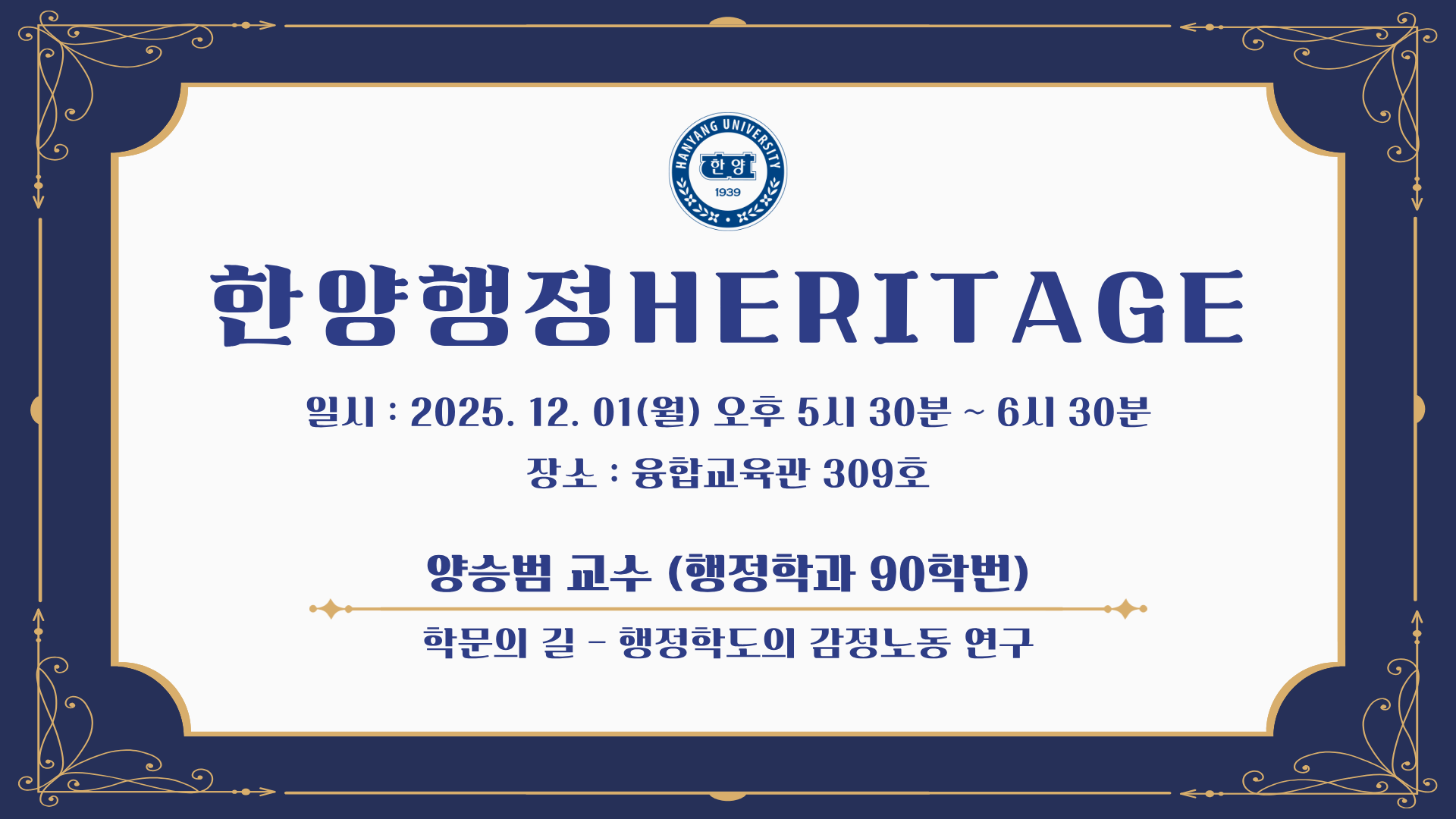 2025년 하반기 행정학과 한양행정Heritage와 관련하여 다음과 같이 안내드립니다.