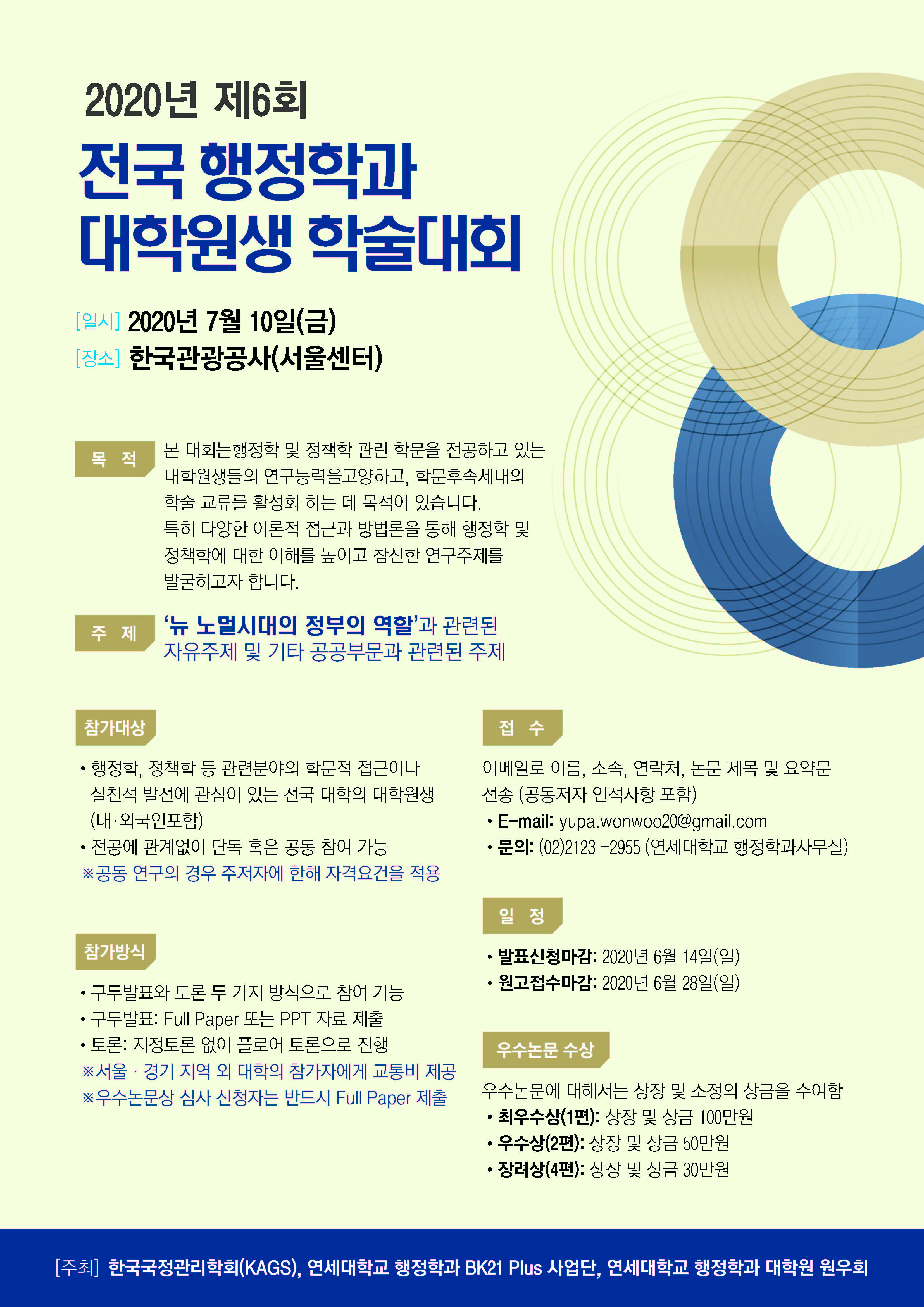안녕하세요 제6회 전국 행정학과 대학원생 학술대회를 아래와 같이 안내드립니다.