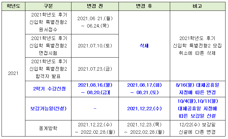 2021학년도 대학원 학사일정 변경을 다음과 같이 안내합니다.