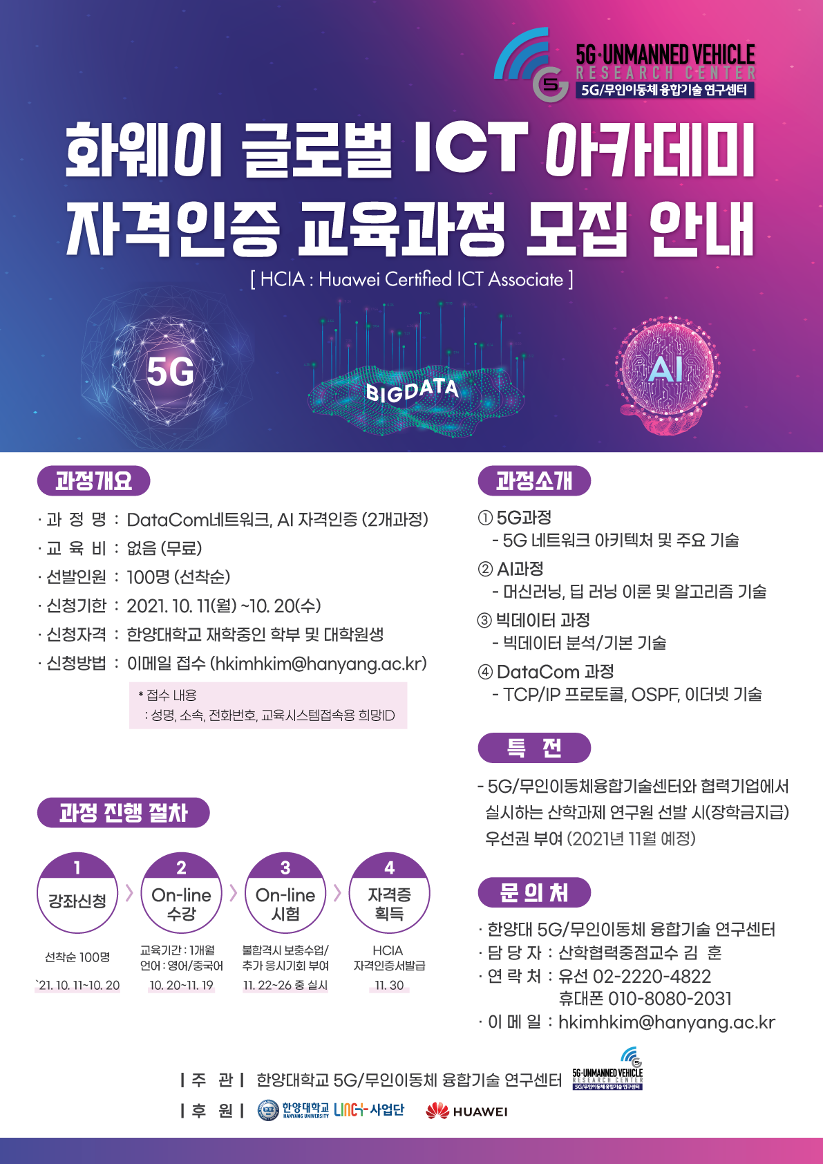 -HCIA 자격인증서 발급, 5G/무인이동체융합기술센터와 협력기업에서 실시하는 산학과제 연구원 선발 시(장학금 지급) 우선권 부여(2021년 11월 예정)
