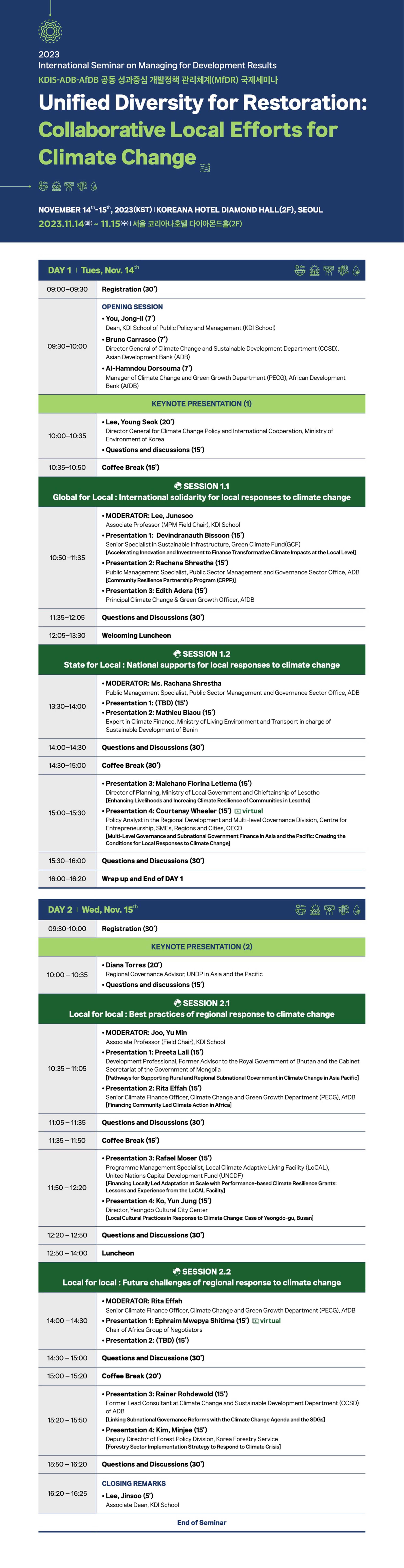 가. 행 사 명: 2023 KDI대학원-ADB-AfDB 공동 성과중심 개발정책 관리체계(MfDR) 국제세미나 'Unified Diversity for Restoration: Collaborative Local Efforts for Climate Change'