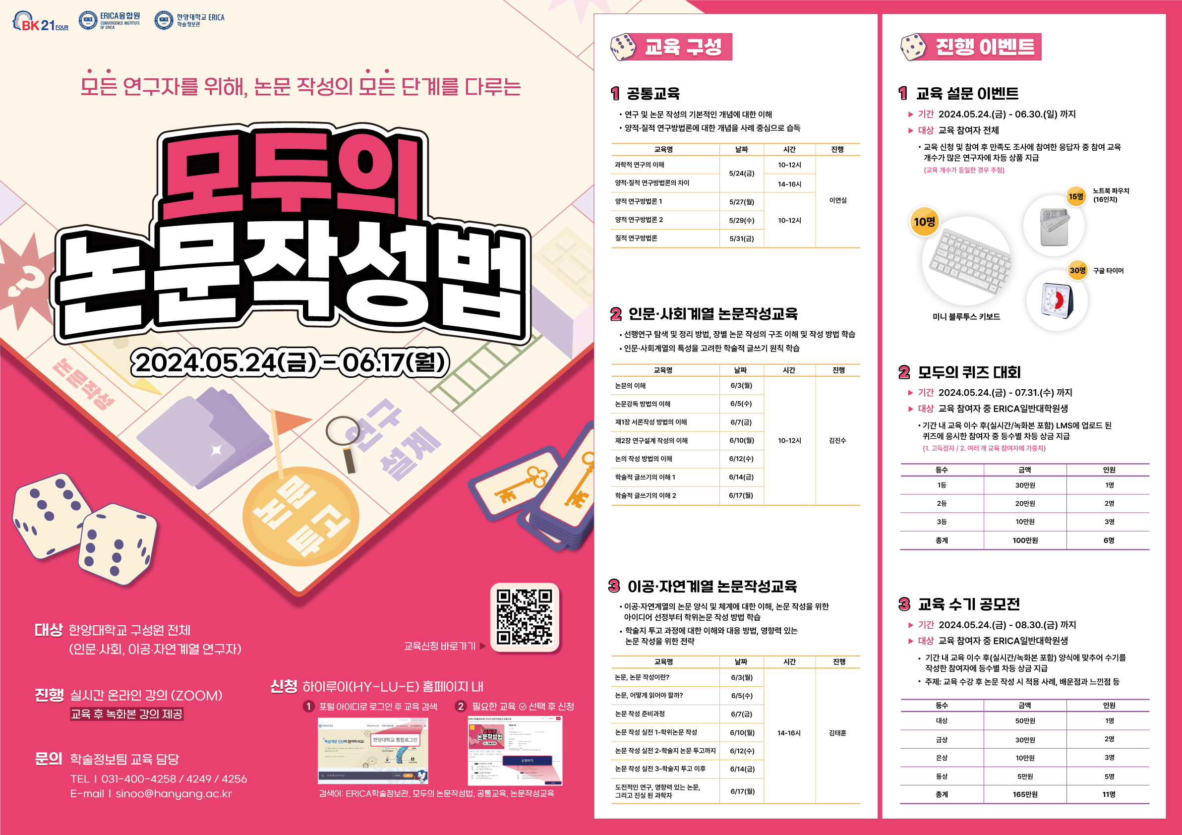 ERICA학술정보관에서는 4단계 BK21 대학원혁신사업의 일환으로 「모두의 논문작성법」교육을 진행합니다. 이에 한양대학교 소속 연구자의 많은 참여를 바랍니다.