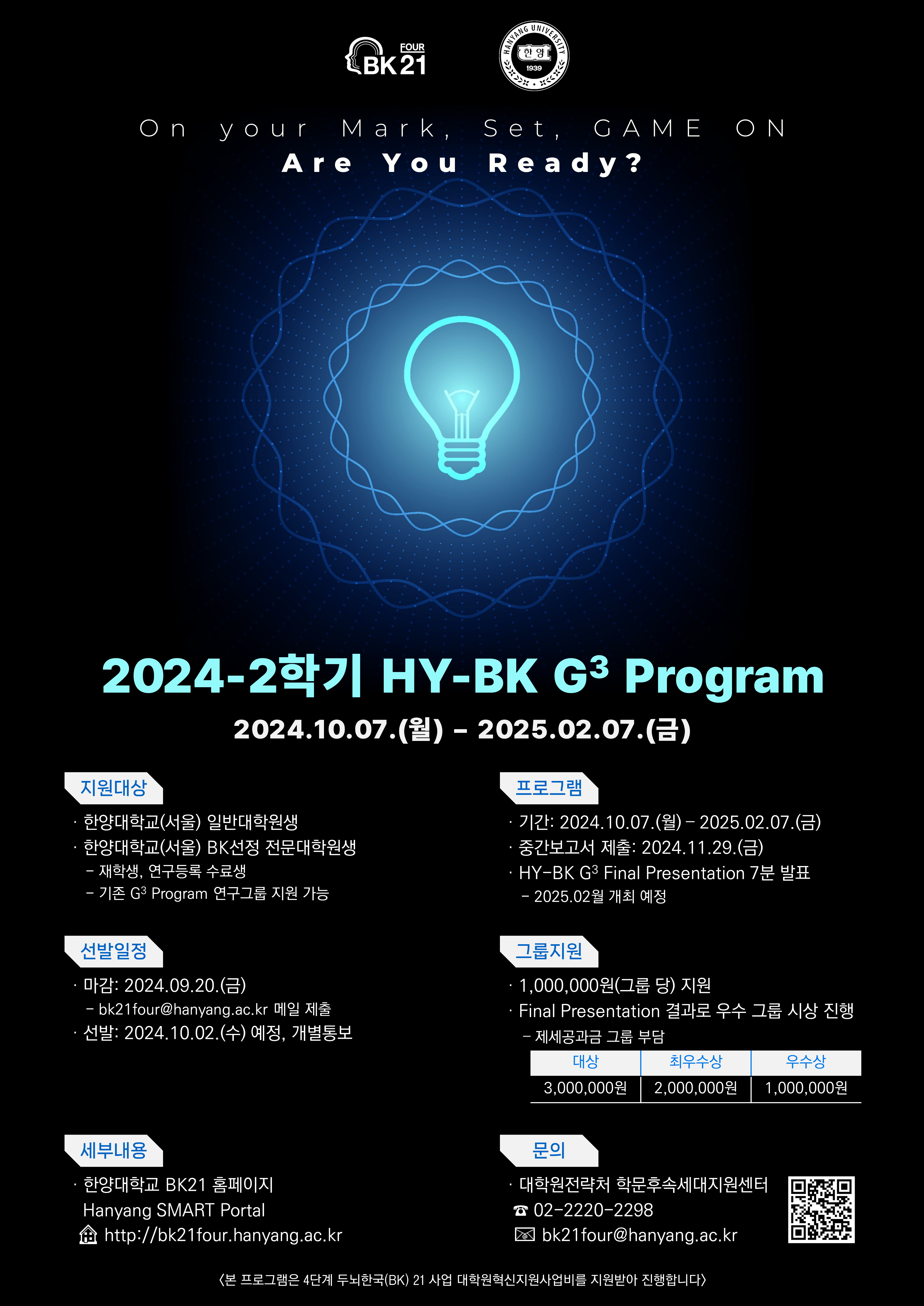 4단계 BK21 대학원 혁신지원사업의 일환으로 2024-2학기 대학원생 융합연구 프로그램(HY-BK G3 Program)을 안내하오니 관심있는 대학원생의 많은 참여 바랍니다.