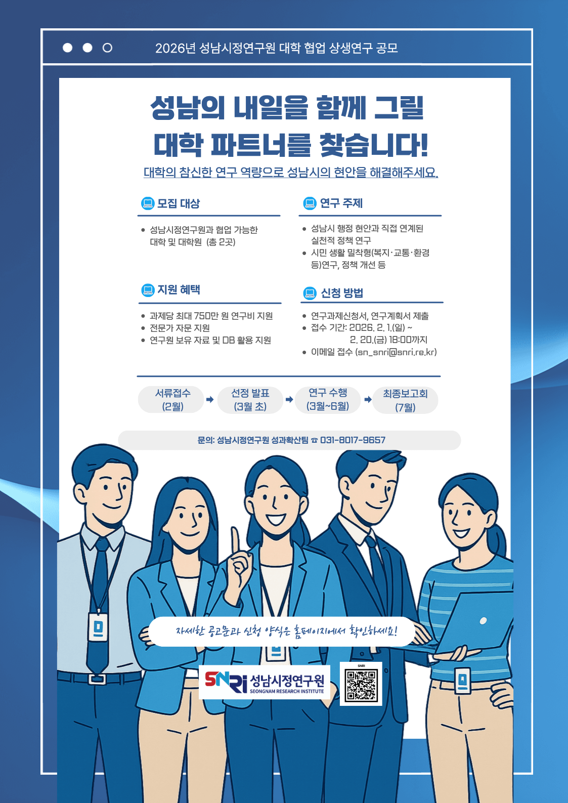 - [성남시정연구원] 2026 대학 협업 상생연구 공모 신청요강.pdf 106.9KB Hit 6