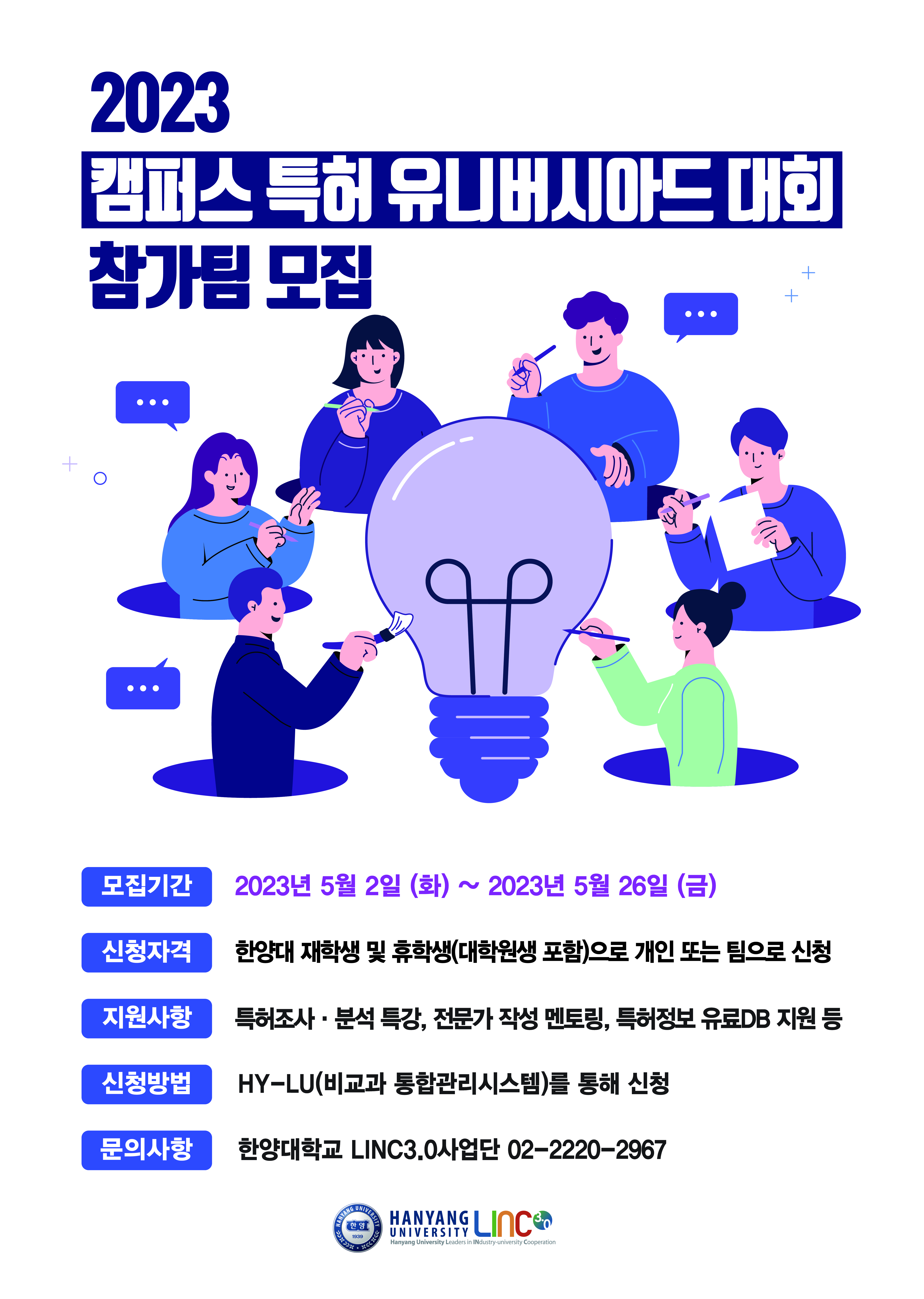 LINC3.0사업단은 실용적인 특허교육 확대를 통해 기업이 필요로 하는 지식 재산 인재를 양성하기 위해 특허청에서 주최하는 「2023년 캠퍼스 특허 유니버시아드」대회 참가자 및 참가팀을 대상으로 교육과 멘토링을 지원하오니, 관심있는 학생들은 참여 하시기 바랍니다.