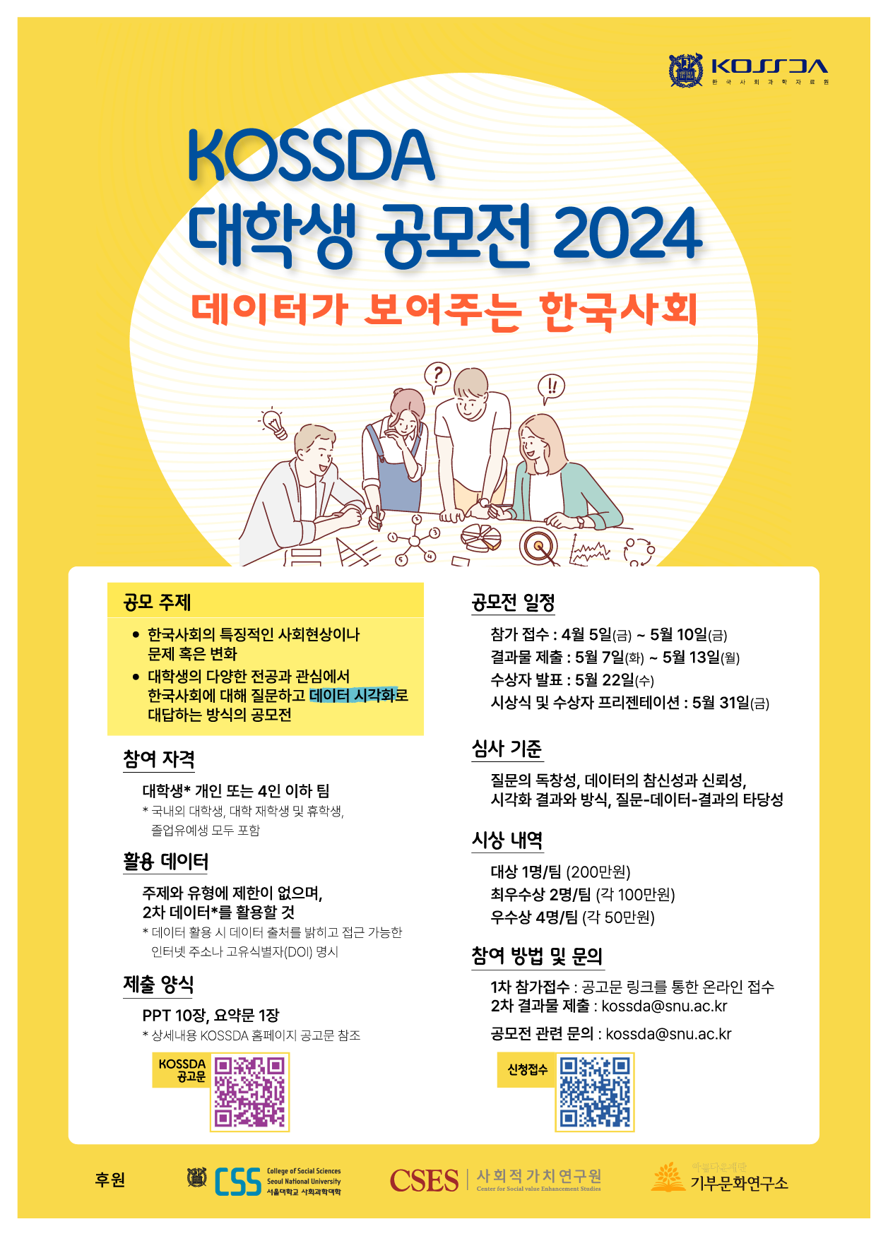 서울대학교 한국사회과학자료원(KOSSDA)은 대학생을 대상으로 데이터에 기반하여 우리 사회에 대한 의미있는 결과를 도출하고 시각화하는 경험 연구에 익숙해지는 기회를 제공하고자 <KOSSDA 대학생 공모전 2024 - 데이터가 보여주는 한국사회>를 개최합니다.