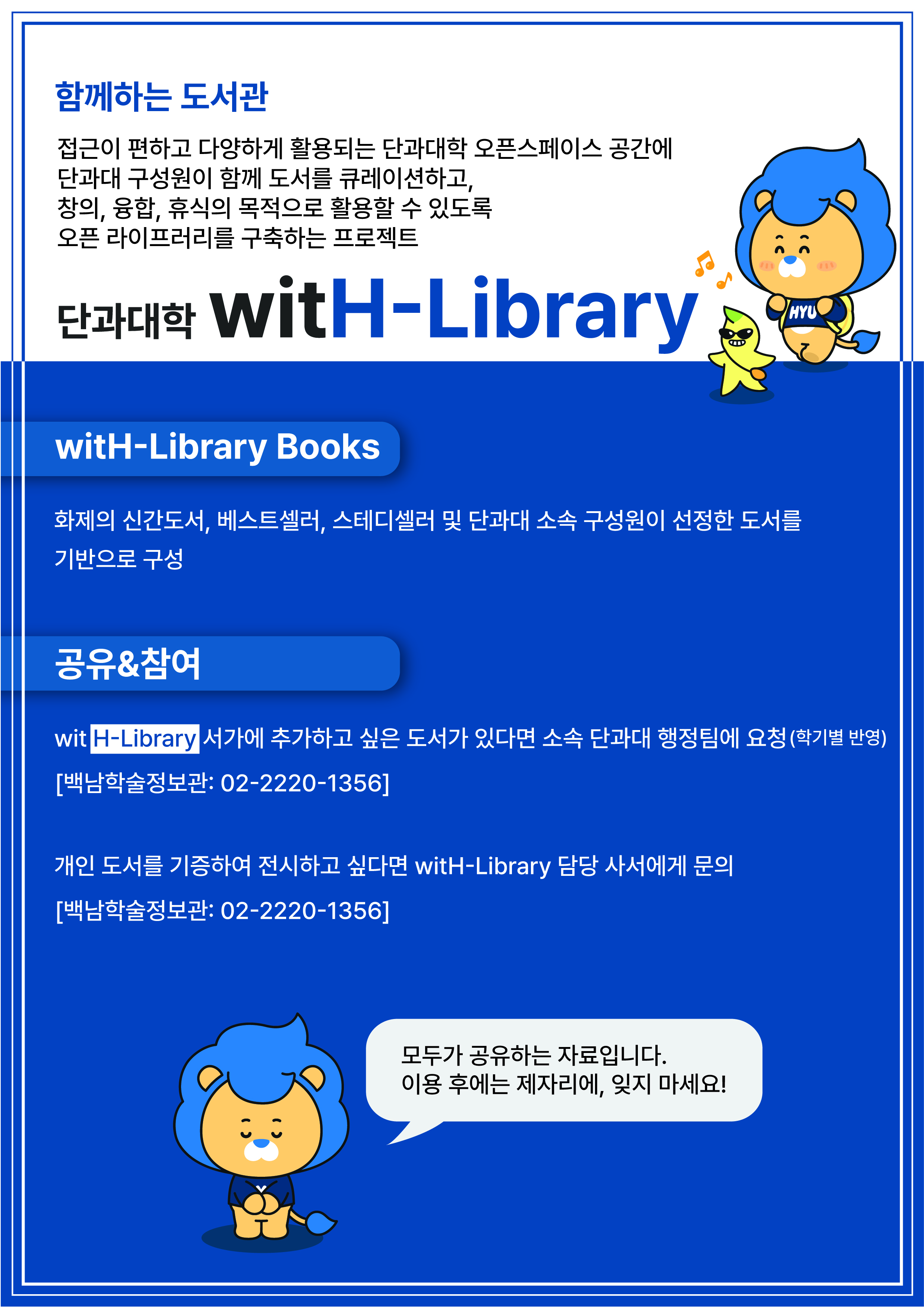 각 단과대학의 오픈 스페이스 공간에 서가를 설치하고 자유롭게 이용 가능한 도서를 제공함으로써, 이용자들의 휴식과 교양 습득을 지원하는 "witH-Library(함께하는 도서관)" 구축 사업을 백남학술정보관에서 진행하고 있습니다.