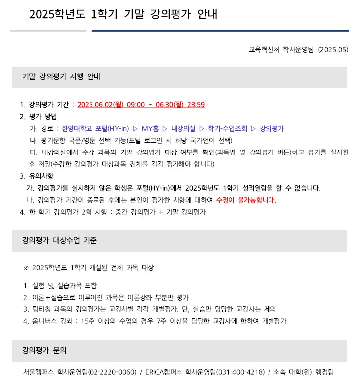 ★★★2025학년도 1학기 기말 강의평가 실시 안내