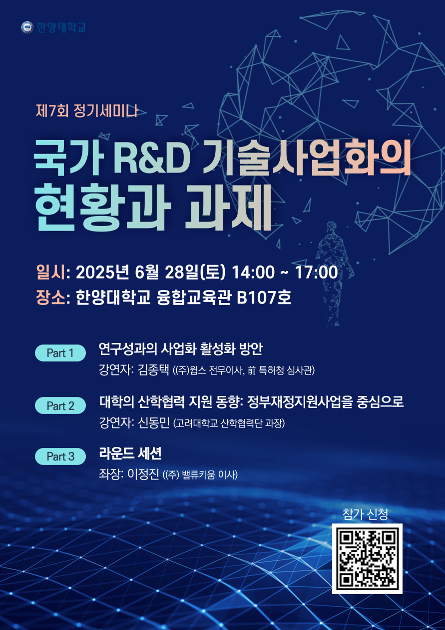 한양대학교 과학기술정책학과에서는 '과학기술전문인력 육성・지원' 사업의 일환으로 재학생 및 참여자 여러분의 지식과 역량을 더욱 높이기 위해 정기적으로 세미나를 개최하고 있습니다.