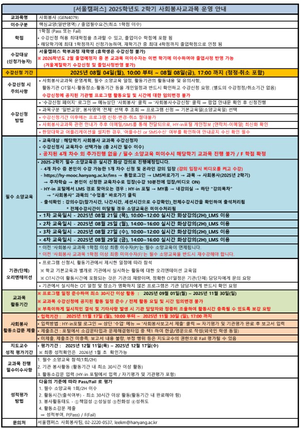 사회봉사단(서울) 사회봉사팀에서는 2025학년도 2학기 사회봉사교과목 수강신청 및 운영 계획을 다음과 같이 안내드립니다.