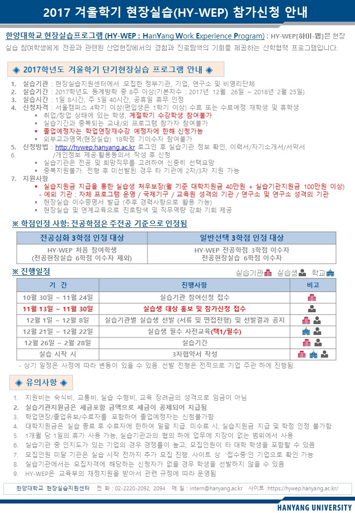 <2017 겨울학기 HY-WEP 단기현장실습 운영 안내>에 대해 안내드립니다.