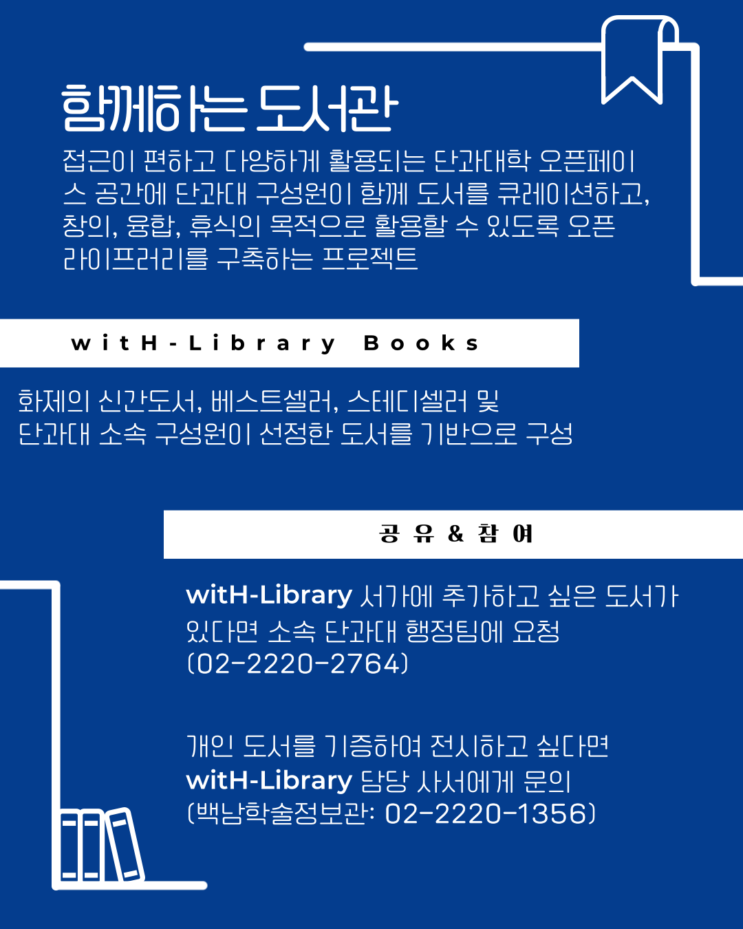 각 단과대학의 오픈 스페이스 공간에 서가를 설치하고 자유롭게 이용 가능한 도서를 제공함으로써, 이용자들의 휴식과 교양 습득을 지원하는 "witH-Library(함께하는 도서관)" 구축 사업을 백남학술정보관에서 진행하고 있습니다.