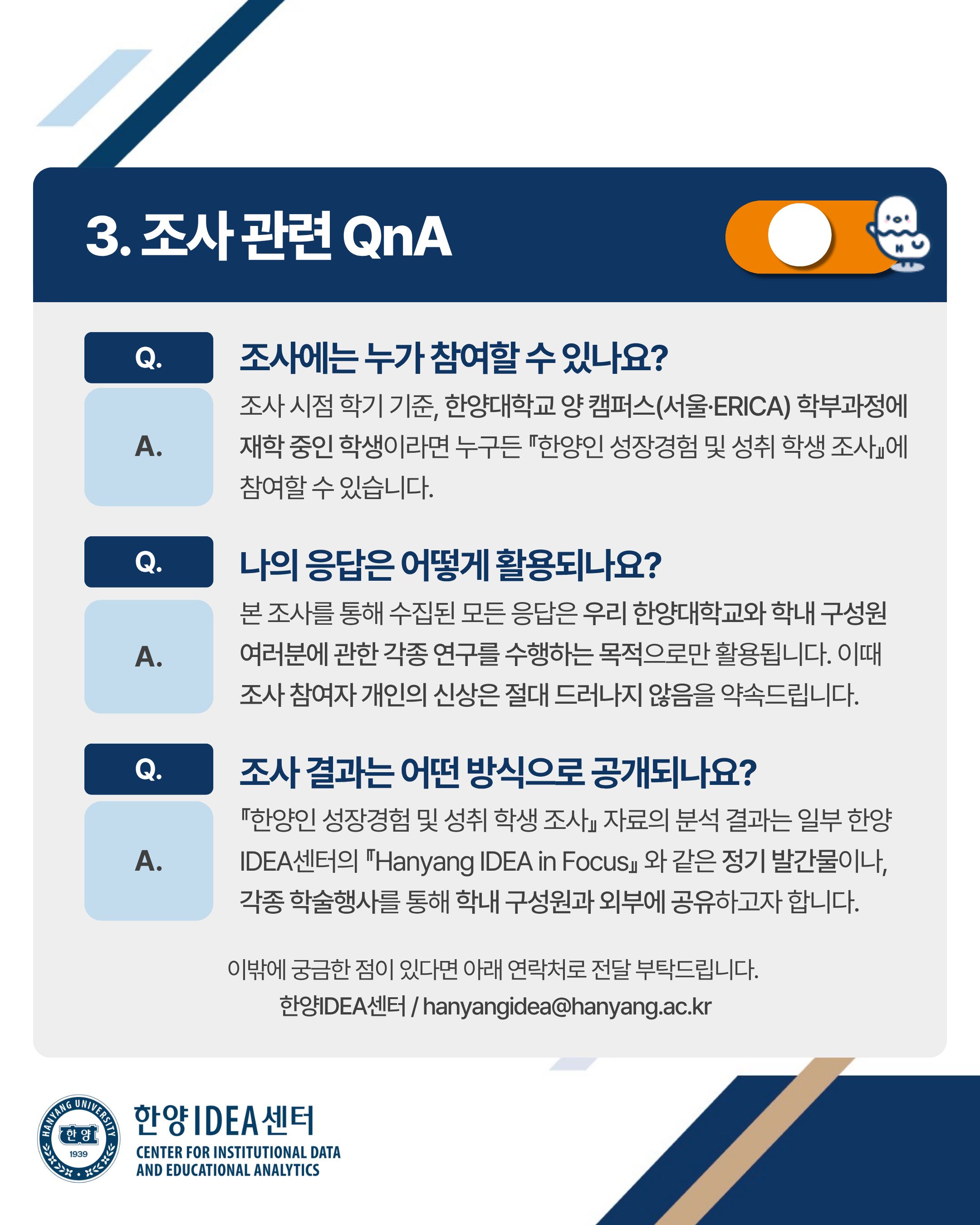 1. 기획처 한양IDEA센터에서는 2025년 12월 중 우리 대학 서울·ERICA 학부 재학생을 대상으로, 대학 생활 전반에서의 경험을 파악하고 이에 기반하여 학내 여러 유용한 정책과 프로그램을 개발 및 제공하고자 '한양인 성장경험 및 성취 학생 조사'(Hanyang IDEA Student Survey)를 시행하고 있습니다.