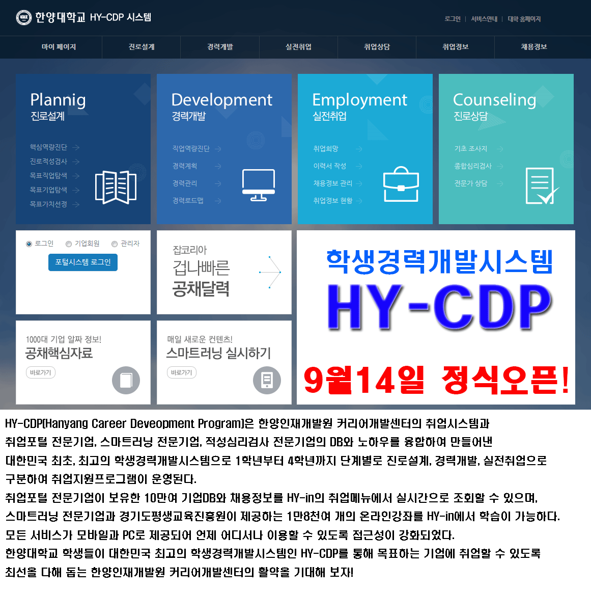 커리어개발센터에서는 학생경력개발시스템 HY-CDP 오픈과 관련하여 다음과 같이 안내합니다.