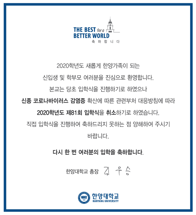 2020학년도 제81회 입학행사 취소에 대한 안내입니다.
