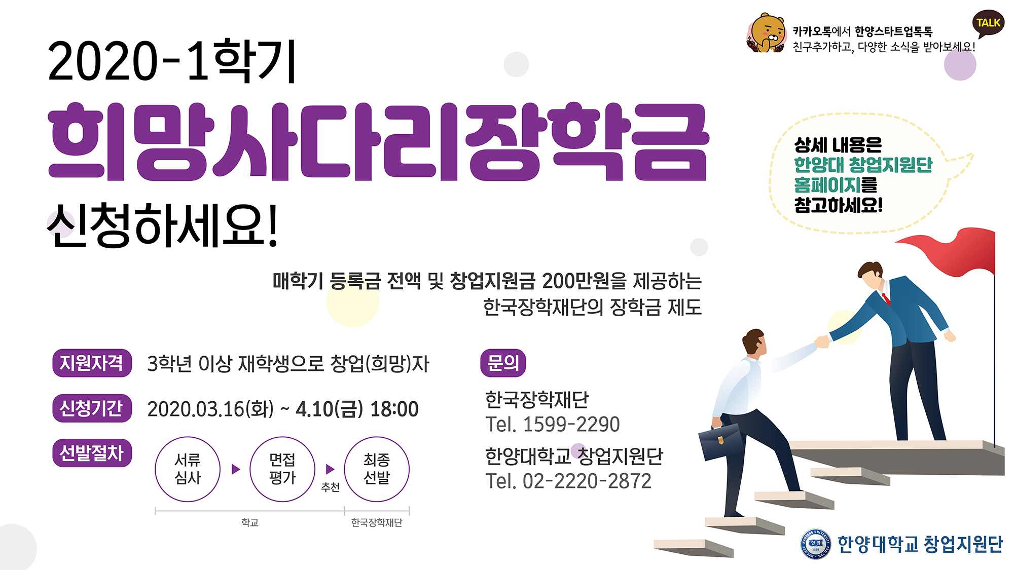 우리 대학 창업지원단에서는 한국장학재단의 2020년 1학기 희망사다리 장학금(창업지원형) 신규 장학생을 모집하고 있습니다.