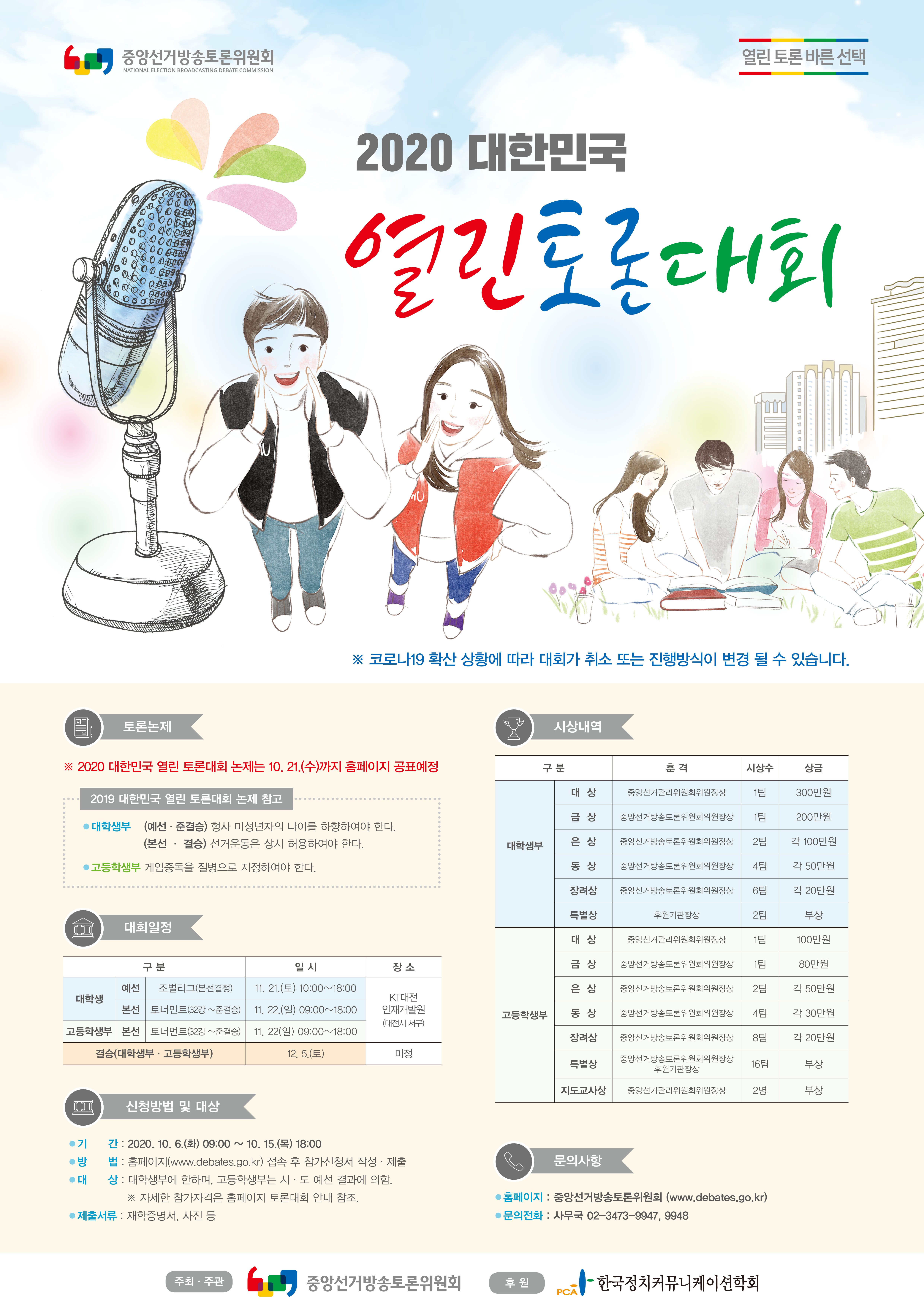 3. 이와 관련하여 오는 11. 21.(토) ~ 11. 22.(일) 양일간 개최하는 「2020 대한민국 열린 토론대회」에 대해 붙임과 같이 안내하오니, 소속 학생들이 참여할 수 있도록 학교 홈페이지 및 게시판 등을 통해 적극 안내하여 주시기 바랍니다.
