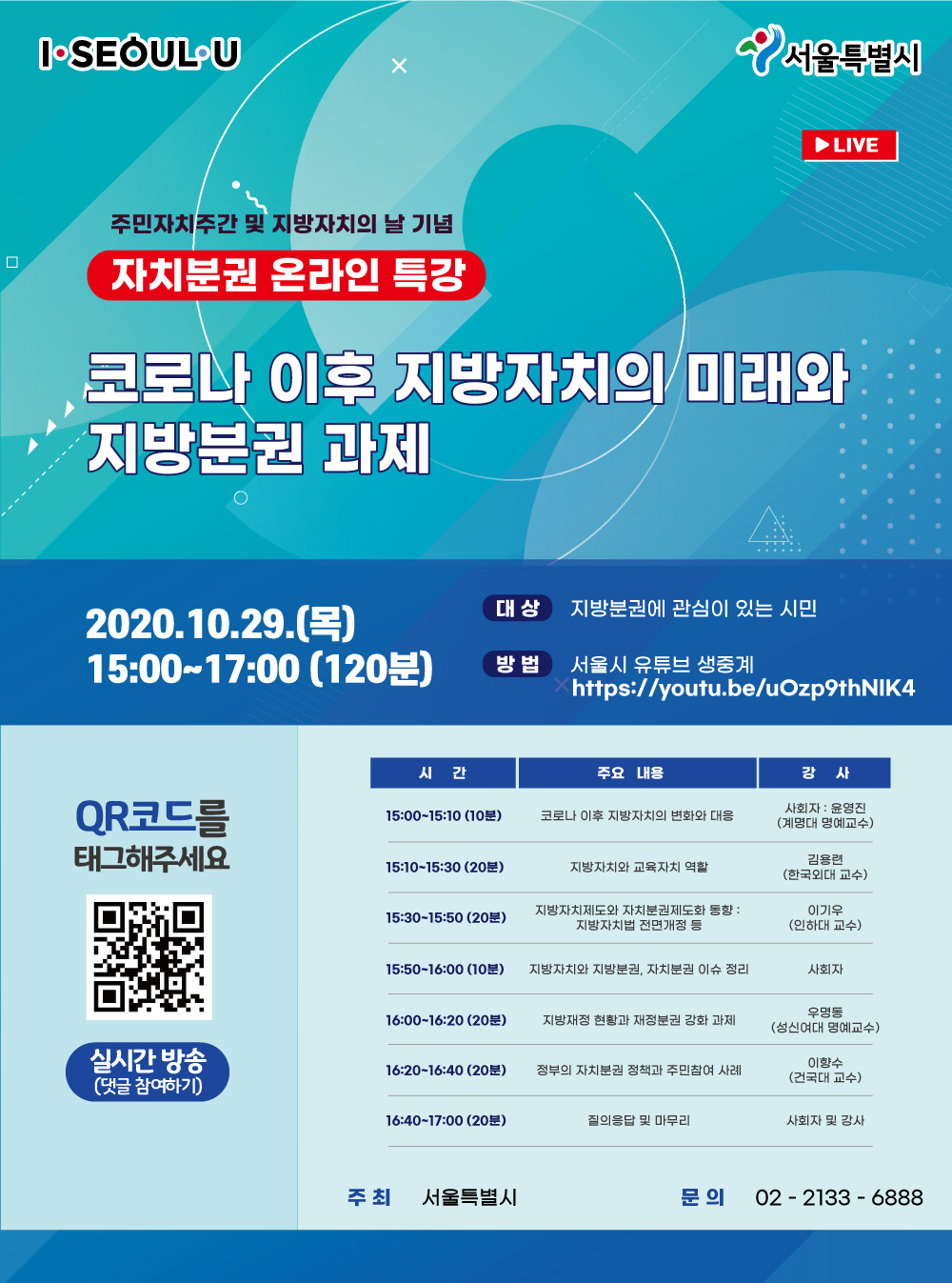 1. 서울시에서는 2020년 주민자치주간 및 지방자치의 날 기념『자치분권 온라인 특강』을 ‘코로나 이후 지방자치의 미래와 지방분권 과제’라는 주제로 개최할 예정입니다.2. 서울시 유튜브 공식채널에서 생중계되며, 지방분권에 관심이 있는 시민 누구나 실시간 참여가능하오니 많은 분들이 참여할 수 있게 적극적인 홍보와 참여 요청드립니다.