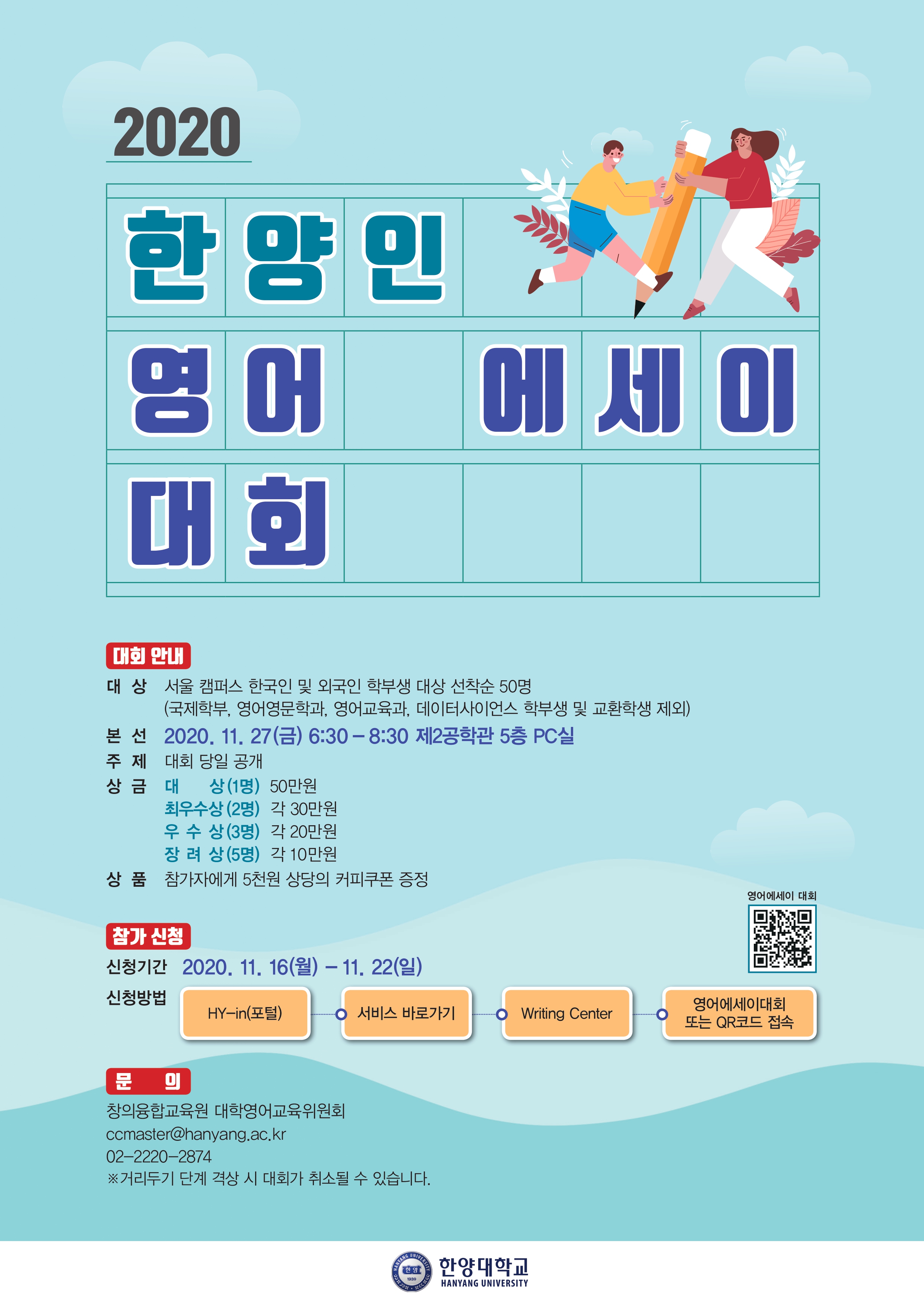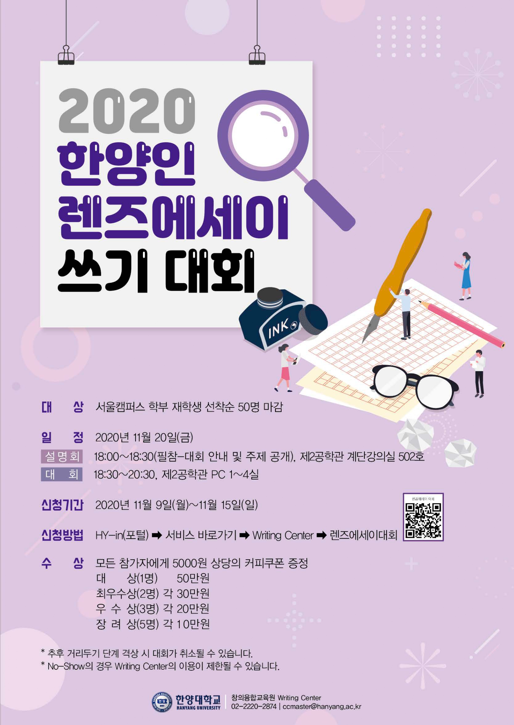 창의융합교육원 Writing Center에서 교내 에세이대회를 진행합니다. 학생들의 많은 관심 부탁드립니다.
