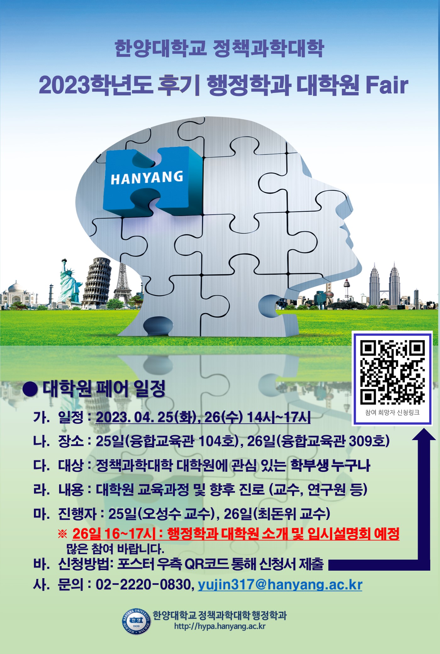 정책과학대 학부생을 대상으로 '2023년 후기 행정학과 대학원 FAIR'를 진행합니다.