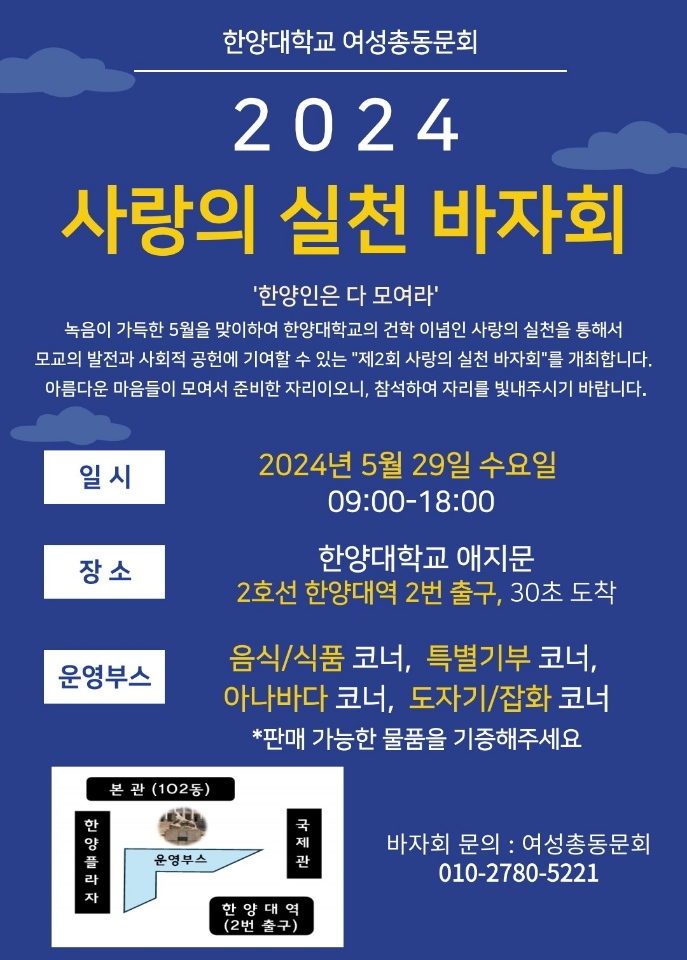 바자회 모든 수익은 한양대학교 장학금으로 기부할 예정으로 학생 및 교직원 대상의 다양한 물품을 마련할 예정입니다.