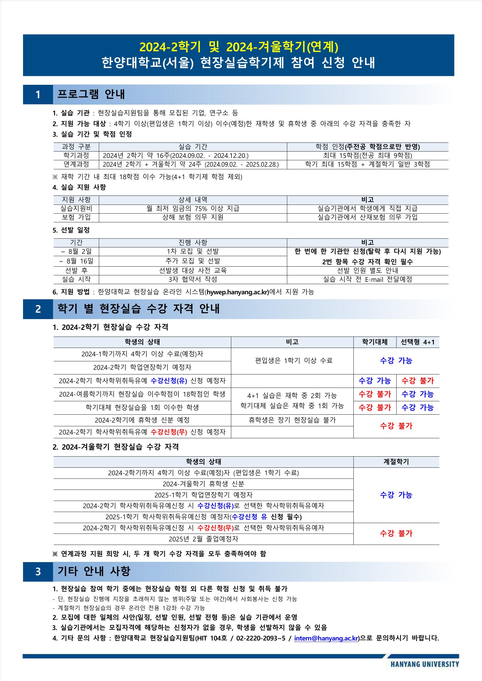 2024학년도 2학기 및 겨울학기 현장실습 운영 안내